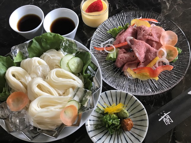 ランチに夏期限定メニューが加わりました。ローストビーフサラダ冷やし素麺 1,100円。