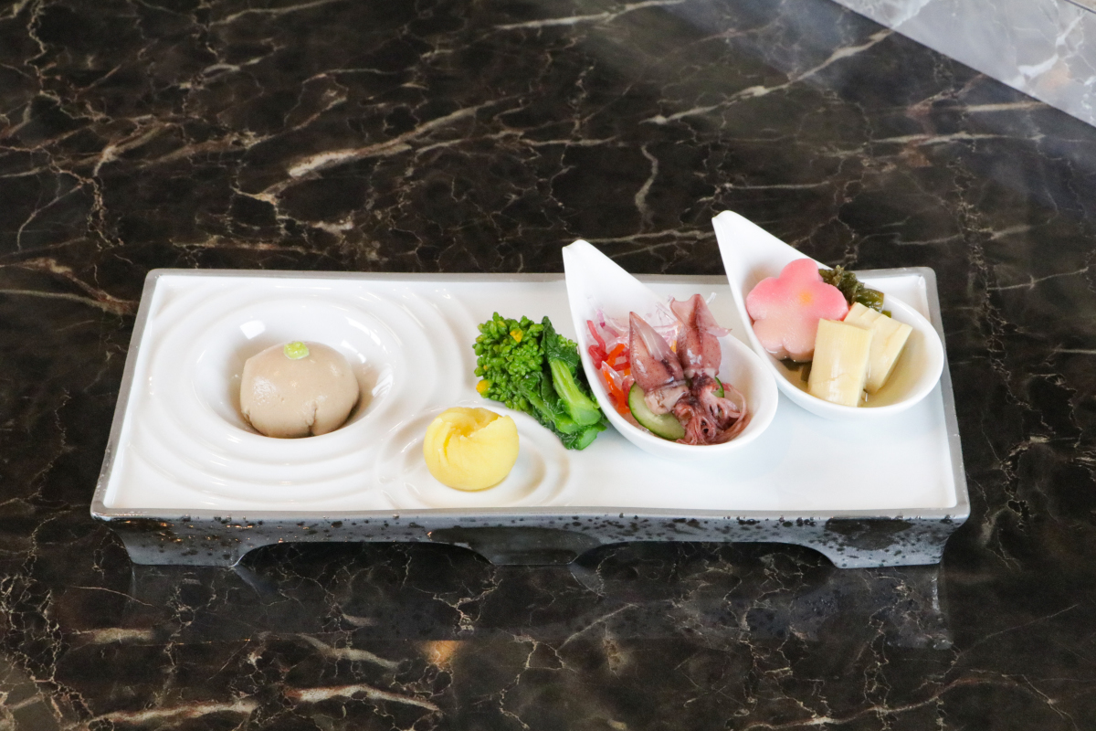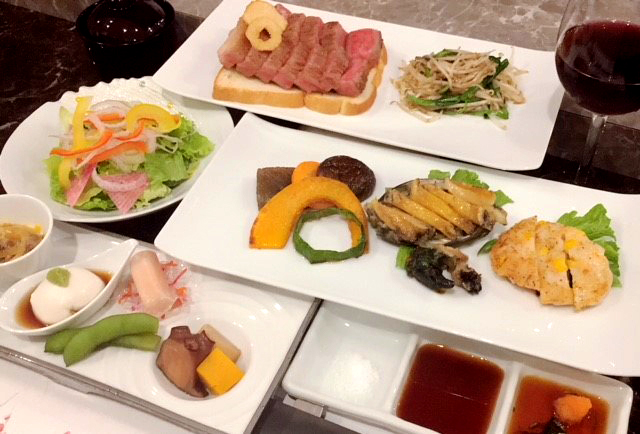 | (小鉢・焼野菜・海鮮3種・エゾ鮑・サラダ・海老パテ・ご飯セット) | ||
