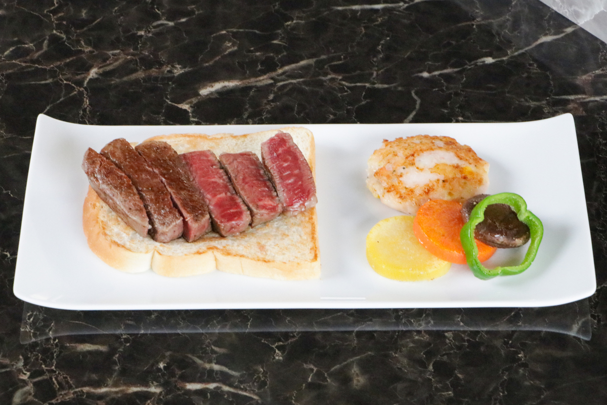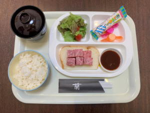 | (サイコロステーキ・サラダ・ご飯・汁物・デザート) |
