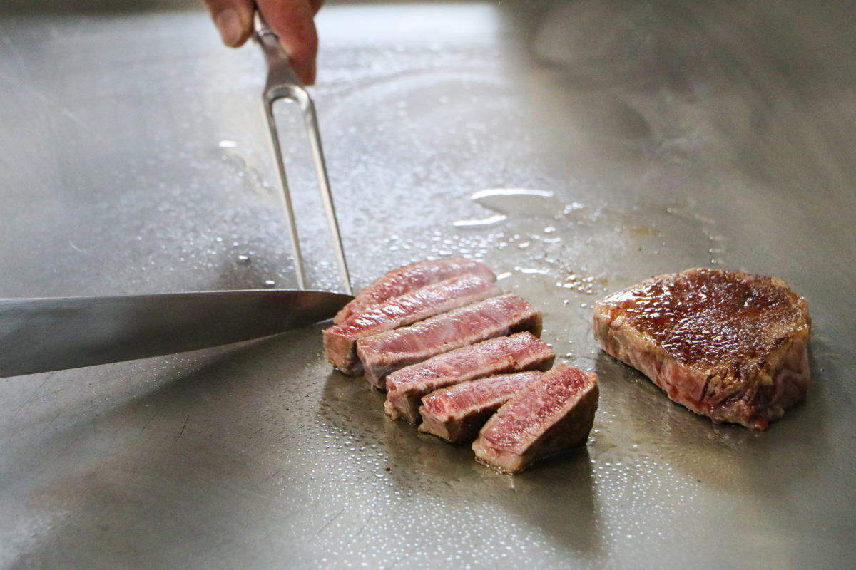 | 和歌山県産ブランド肉「熊野牛」特選モモ肉を使用した鉄板焼蘭の新登場メニューです。 洗練された技術でサッと焼き上げ、食べやすいサイズにカットしたステーキを自家製のタレやポン酢、 塩などお好みの味付けでお楽しみ頂けます。 また、アワビ付コースのアワビは非常に柔らかく調理致しており、伊勢海老付きコースの伊勢海老 の頭はお味噌汁に調理致しております。アワビ、伊勢海老共に大変ご好評を頂いております。 |